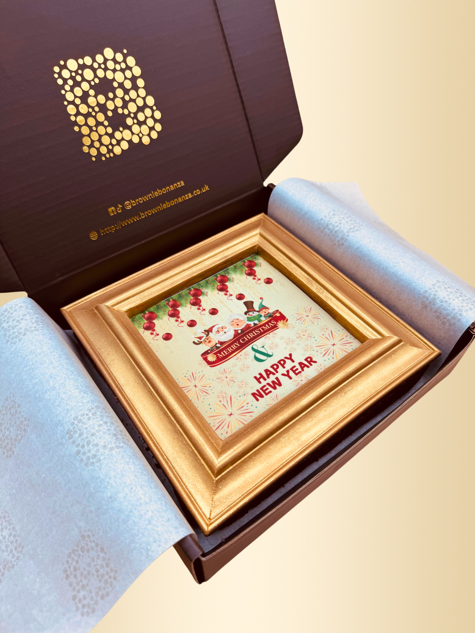 This rich and decadent chocolate fudge brownie is topped with a luxurious chocolate ganache and hand-decorated with an edible Christmas design. The Belgian milk chocolate frame adds a touch of elegance, dusted with 100% edible lustre. Perfect for gifting or celebrating the holiday season.