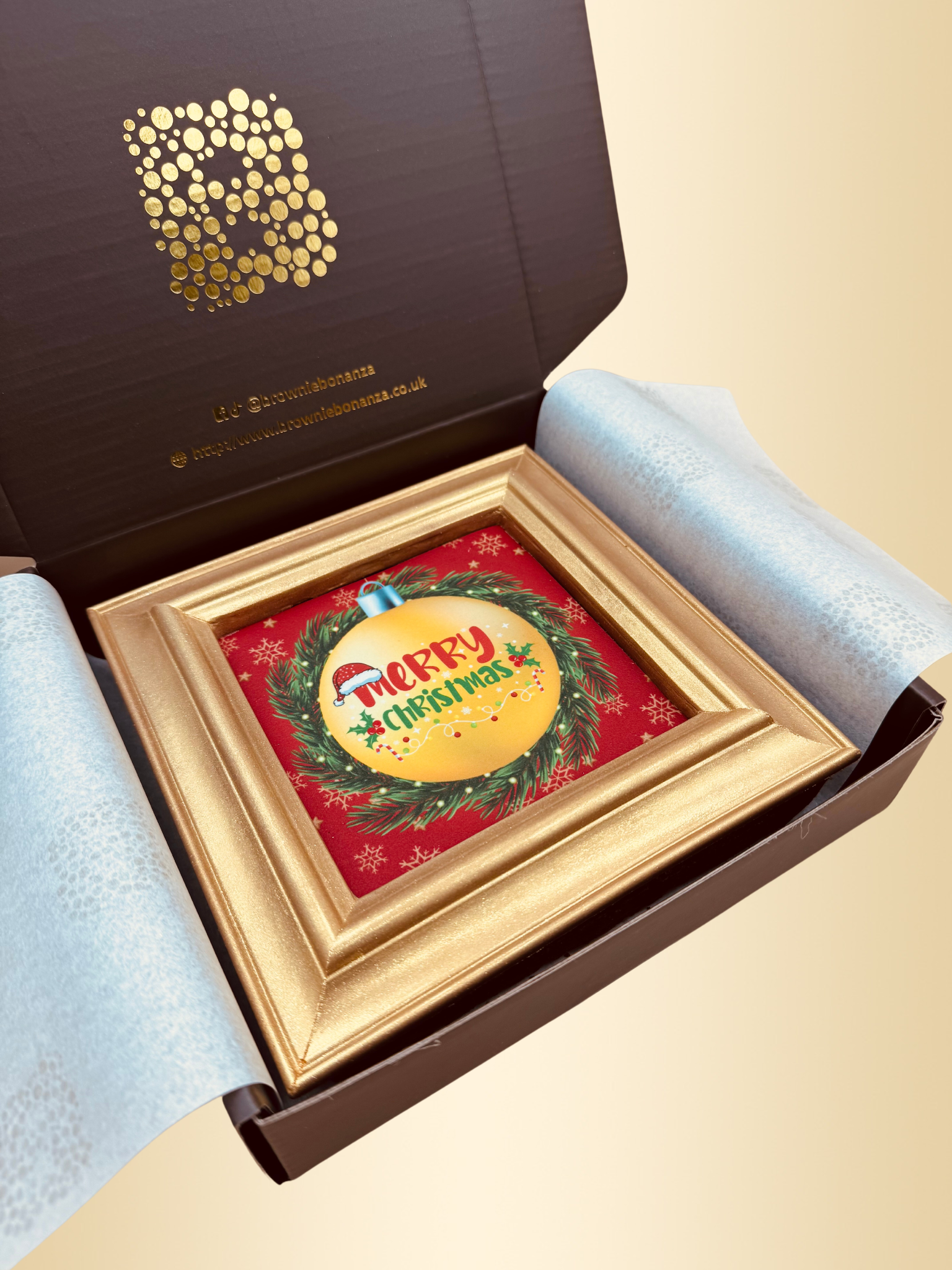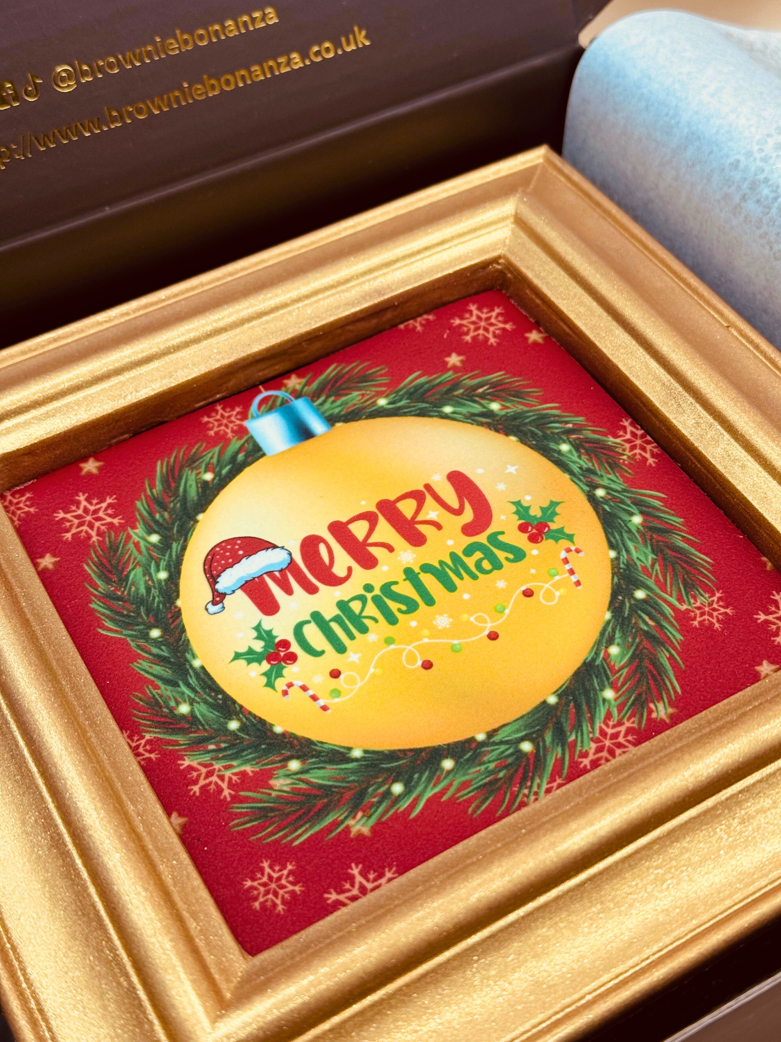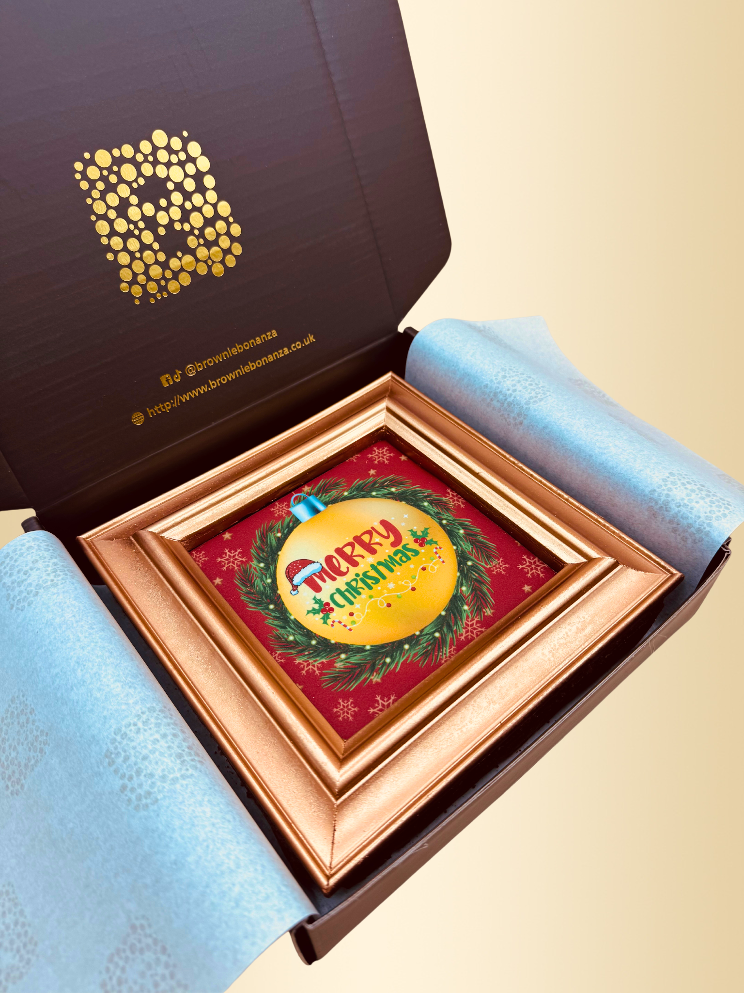 This festive Christmas Brownie features a rich fudge brownie base, decadently topped with chocolate ganache. Adorned with an edible Christmas design on an icing sheet, all surrounded by a Belgian milk chocolate frame dusted with 100% edible lustre dust. Indulge in the perfect blend of flavours and holiday cheer.