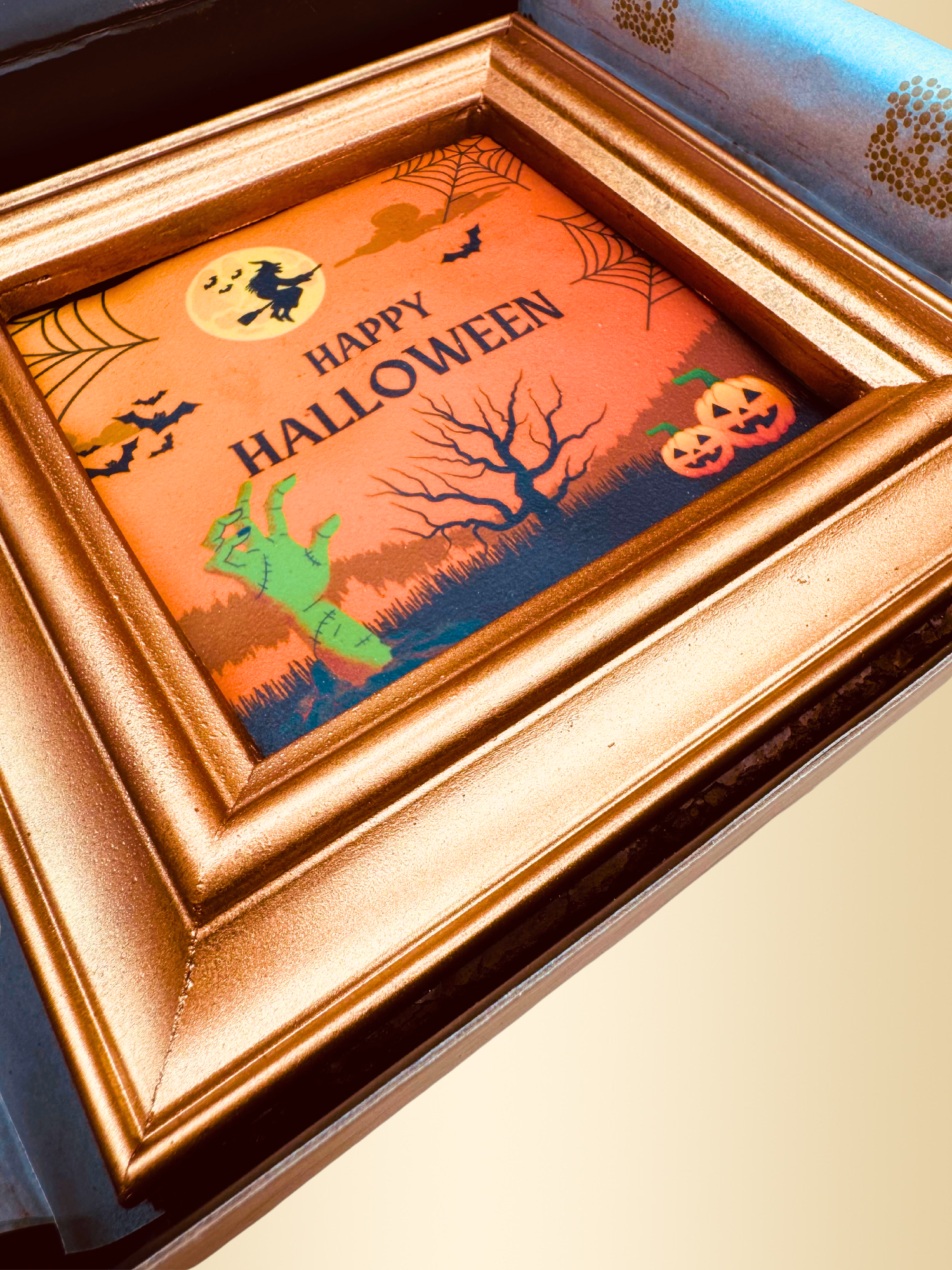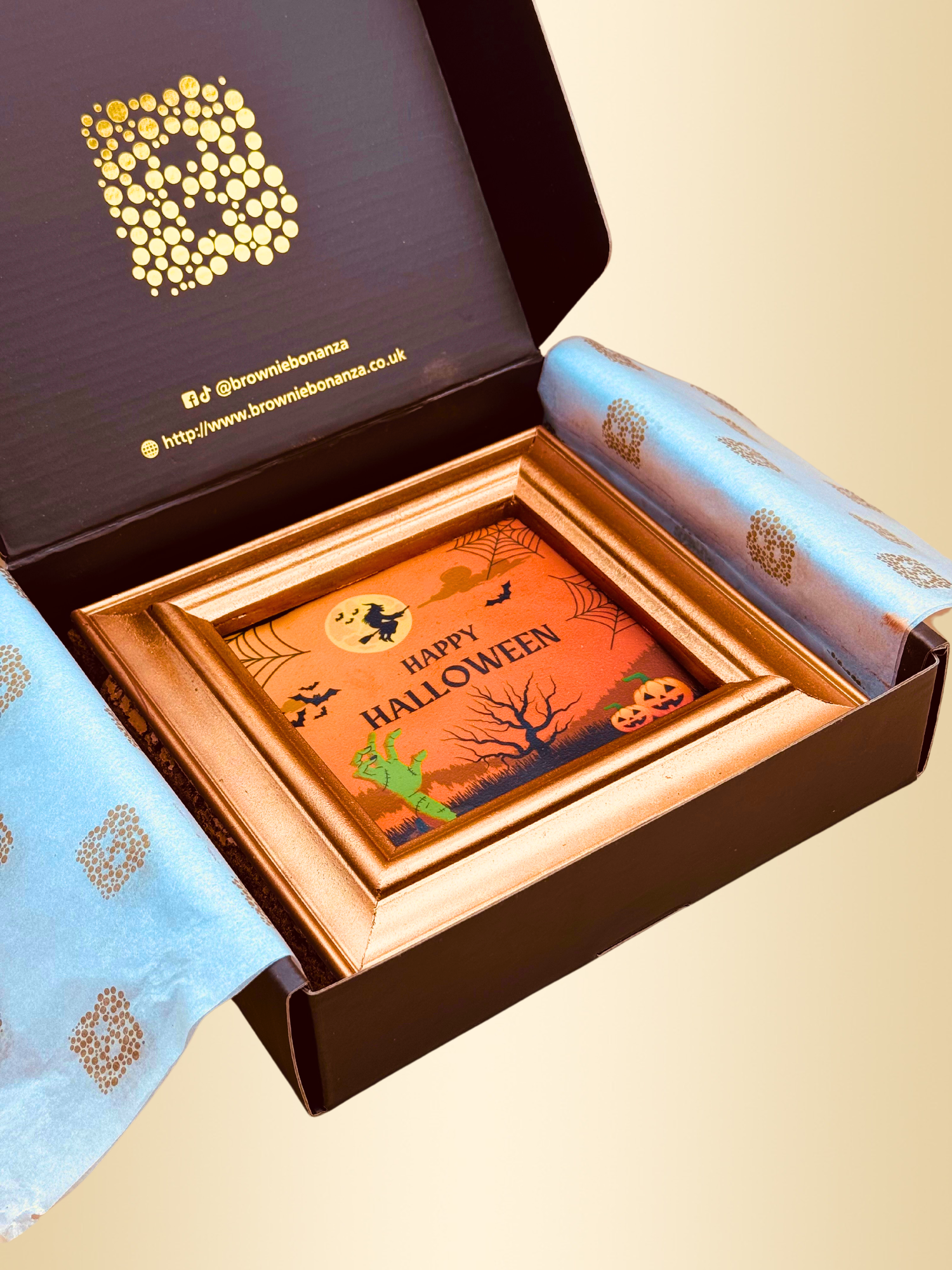 Indulge in our Halloween frame Brownie, a fudge brownie topped with rich chocolate ganache and adorned with a 100% edible haunted Halloween design. The Belgian chocolate frame, dusted with 100% edible bronze lustre dust, adds a touch of elegance to this spooky treat. Perfect for Halloween celebrations or as a unique gift for the holiday.